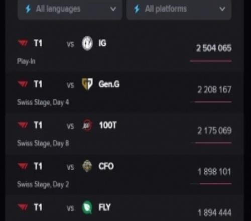 体育资讯10月24日报道宣称 外媒统计S15全球总决赛至今海外峰值前五的比赛均有T1,具体如下: