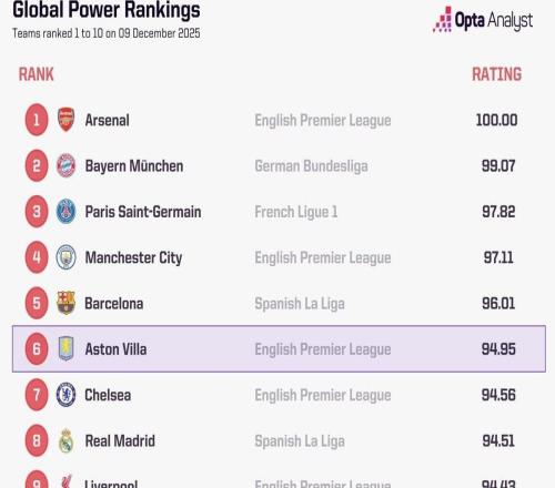 北京时间12月9日,知名数据机构Opta列出了全球范围内目前实力排名前10的俱乐部,阿森纳、拜仁慕尼黑以及巴黎圣日耳曼位列前三,上周末绝杀枪手的阿斯顿维拉位居第6。Opta统计目前
